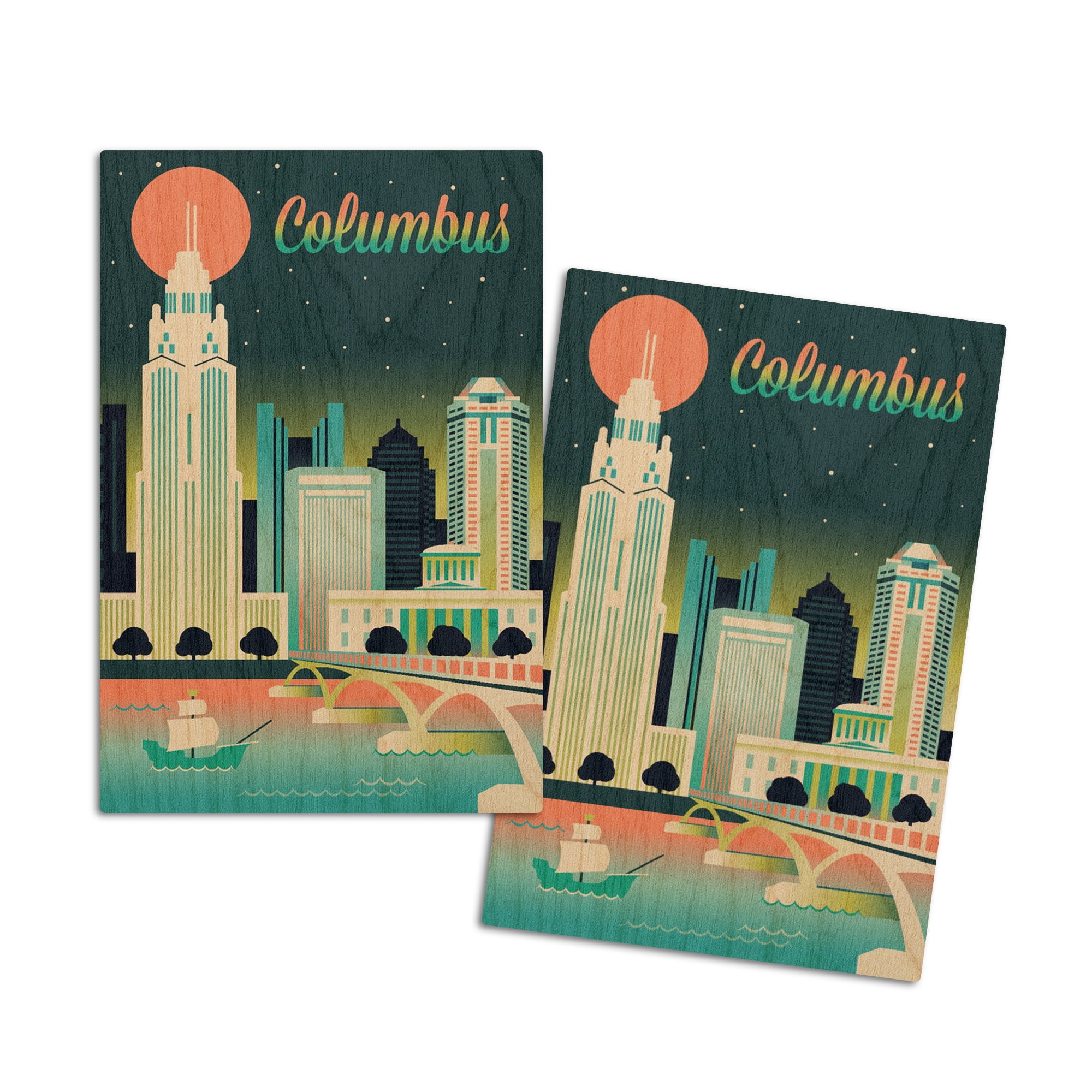 Columbus, Ohio, Retro Skyline Chromatic Series (4x6 Birch Wood Postcards, 2Pack Stationary